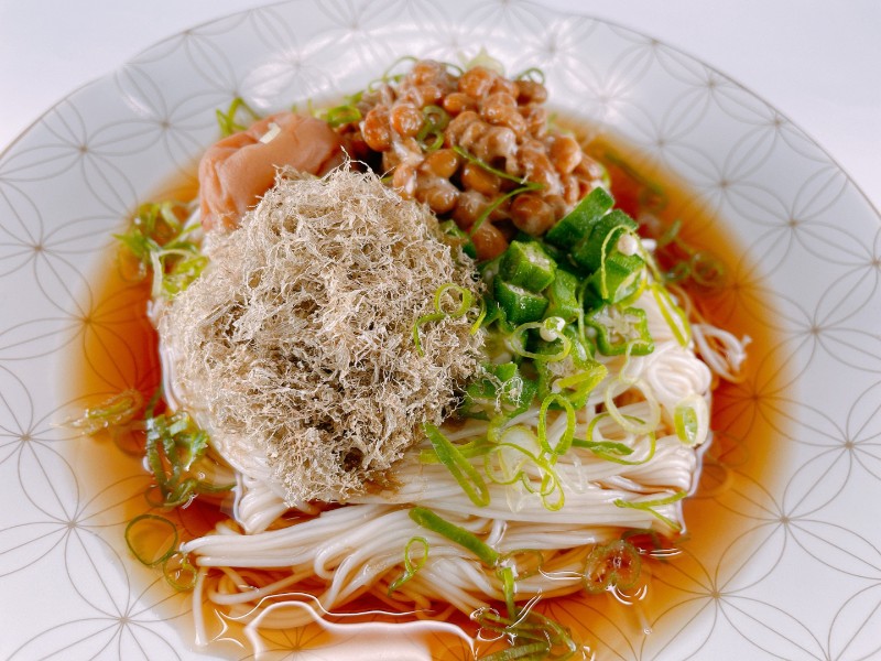 3 | とろろ昆布、オクラ、納豆、梅干し、ねぎを(2)の素麺の上にのせつゆをかける。 |