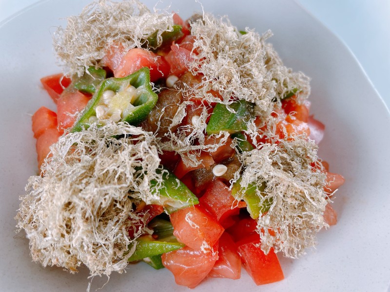| 1 | トマトは2㎝角の角切りにしておく。 オクラは水洗い後、塩をまぶして板ずりをし、ラップで包み600Wの電子レンジで20秒加熱し、1㎝幅の斜め切りにする。 |